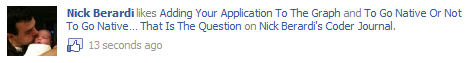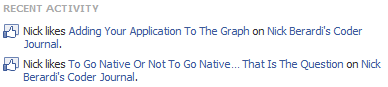 As you can see both of my likes statements were grouped together and property attributed to my blog “Nick Berardi’s Coder Journal”. So Facebook is able to use the meta information that we provide to create nice and fluent statements for the friends in the graph to see. It also creates a nice compact statement that doesn’t create a lot of redundant information for friends who may be interested in what I like.
