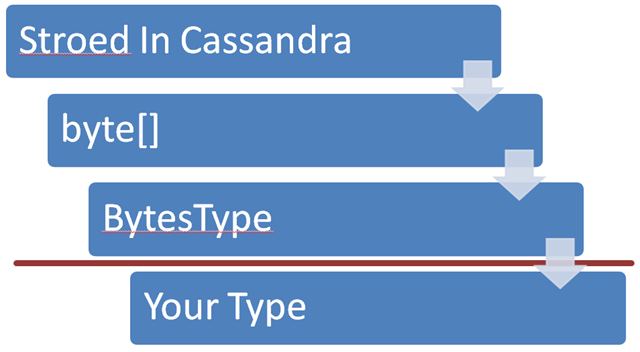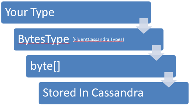 From when you set a property to your chosen type to when it is saved in Cassandra it goes through a two steps that you probably aren’t aware of, first the type is serialized and stored in Fluent Cassandra’s flexible BytesType that is intelligent enough to understand how to serialize common runtime types in to binary so that you as the developer doesn’t have to worry about interacting with the Cassandra database at a low level. This intelligent type system is also the major driver behind the ASCII, UTF8, LexicalUUID, TimeUUID, Long, and Bytes type that also help serialize the Name property of the column correctly.