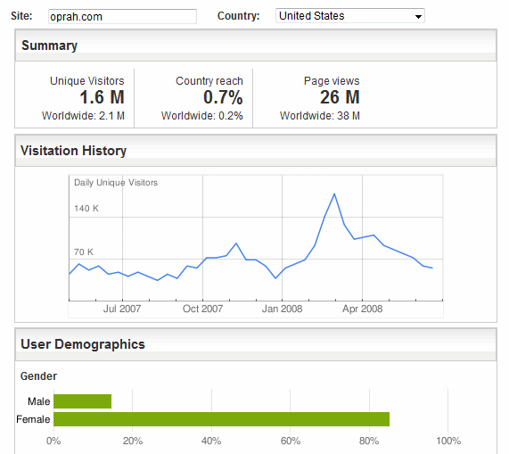 The day I posted the article, Scott instant messaged me to say good job on the article. During the conversation he mentioned that I should compare the stats to Oprah.com as a base point for the other statistics. So naturally I thought this would be a good follow up article.
