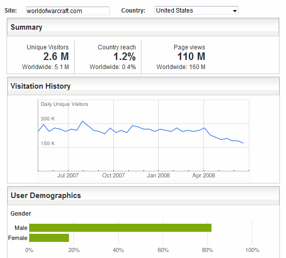 Usually to gauge the effectiveness of a relative score, like the percent of girls that visit your site, you need at least two points that fall on opposite ends of each other. These two points need to be based on similar vectors, in this case women, but are based on an outside source. Obviously Oprah is huge with women, so oprah.com is a natural choice for the high end, but I had trouble thinking of a super-nerdy site that would be suitable for the low end, but have enough traffic to give a good basis point. I finally settled on World Of Warcraft, worldofwarcraft.com, as my low end. Mostly because every time I think of WoW, I think of this South Park episode: