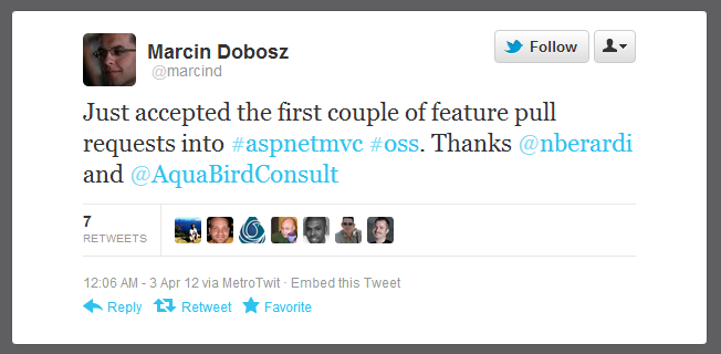 Brad talked to us about what drove this decision with in Microsoft and some of the hurdles they had to over come legally and technically in order to allow people to contribute this source code. I think we are the first podcast to actually talk with a team member on the Web Stack team after the announcement was made, so that was pretty exciting for us. Even I got in on the action and contributed a small patch to ASP.NET MVC that has bugged me since ASP.NET MVC 2.