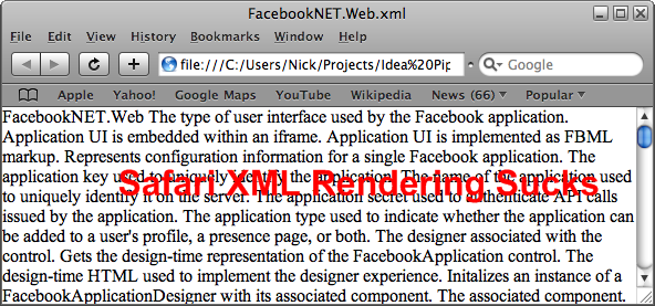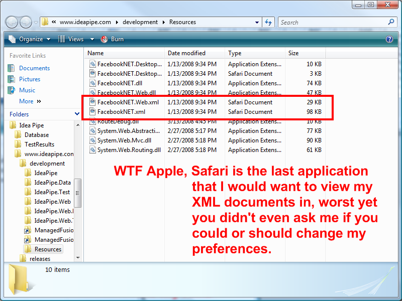 Like any good .NET developer I had the XML file format being opened by Visual Studio, it has a nice viewing, and editing interface that is hard to beat. Today I saw their was a QuickTime update while watching the Facebook Conferences presentation in anticipation of my previous post today. So as I decided to do the update, what a nightmare that has turned out to be. First of all it was 70 MB download, because Apple also decided that iTunes and Safari needed to be downloaded with Quicktime, and bundled them all together. Then it decides to take over all my documents in my system, including HTML, XML, and a bunch of other web related documents. See below.