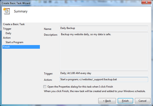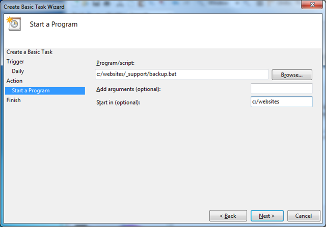 Make sure to fill in the Start in field to be the root of your website, even though it is not the location of your batch file. This is because the batch file is setup from the perspective of that it will be running in the root of the website.